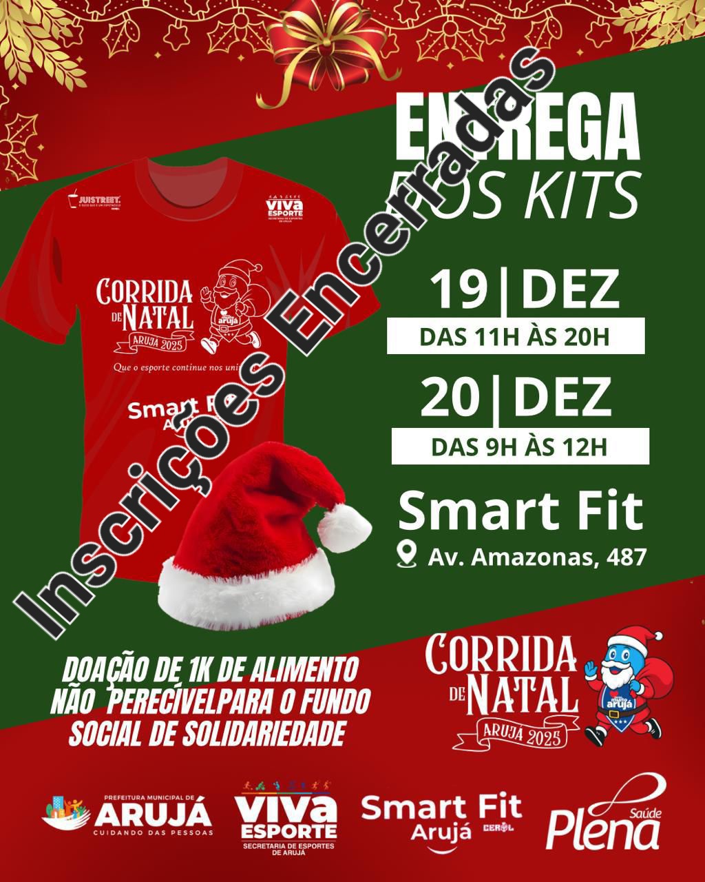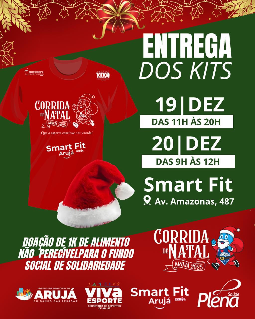 Local e horário de retirada de kits: Sexta 19/12/2025 11:00 as 20:00 - SMART FIT Sábado 20/12/2024 9:00 as 12:00 Local: Smart-fit Arujá Endereço: Av. Amazonas, 487 - Vila Lima II, Arujá - SP, 07402-085